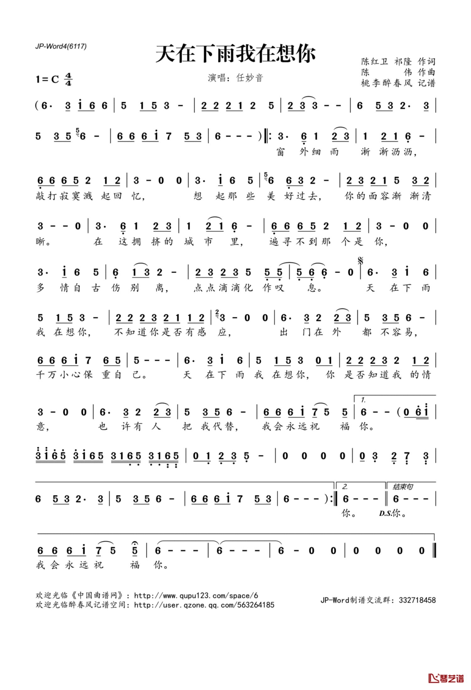 曲谱介绍: 任妙音《​天在下雨我在想你》歌词_简谱