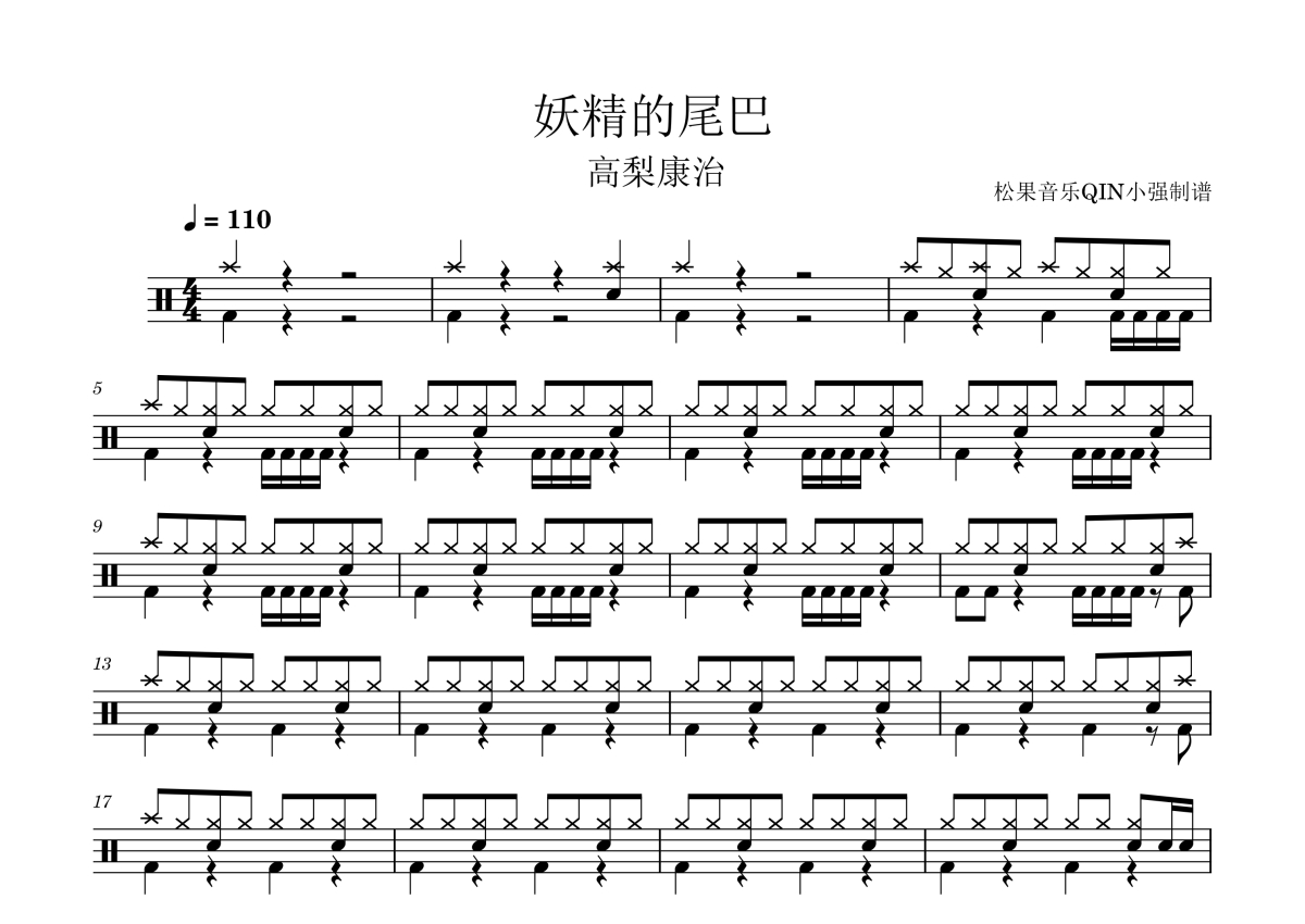 曲谱介绍: 高梨康治《妖精尾巴》架子鼓谱,松果音乐QIN小强编配出品,共有2张高清图谱,免翻页排版设计。