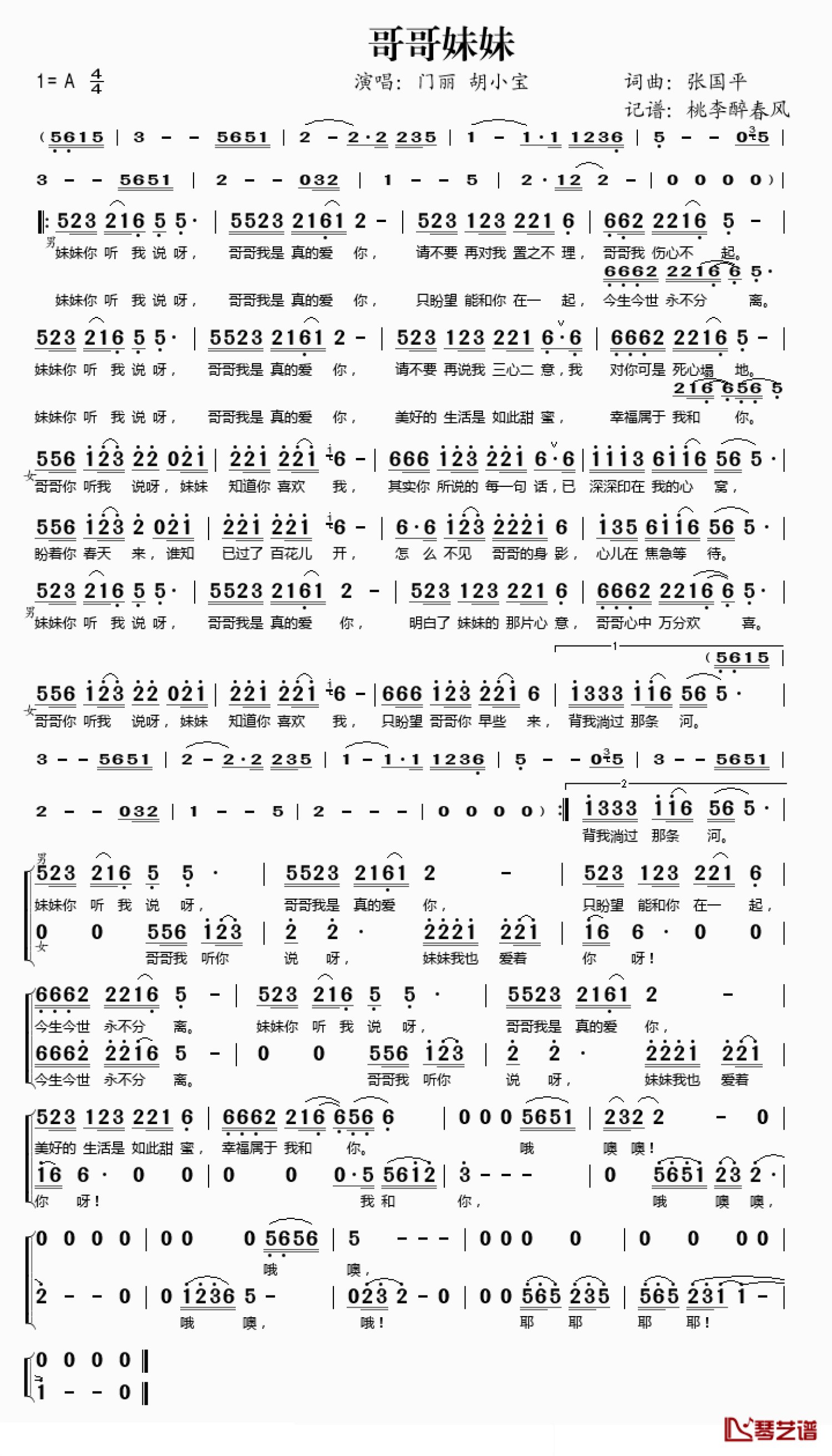 曲谱介绍: 门丽/胡小宝《哥哥妹妹》歌词_简谱