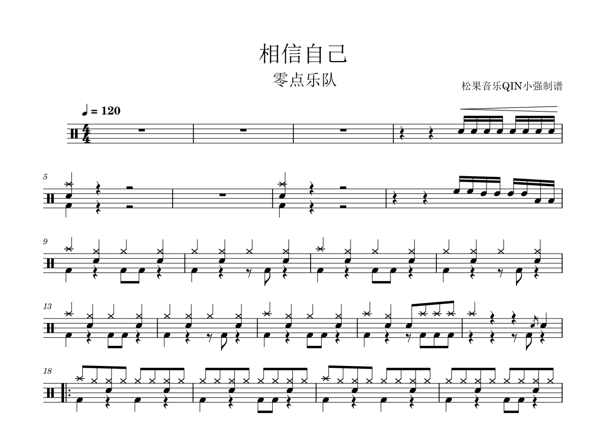 曲谱介绍: 零点乐队《相信自己》架子鼓谱,松果音乐QIN小强编配出品,共有2张高清图谱,免翻页排版设计。