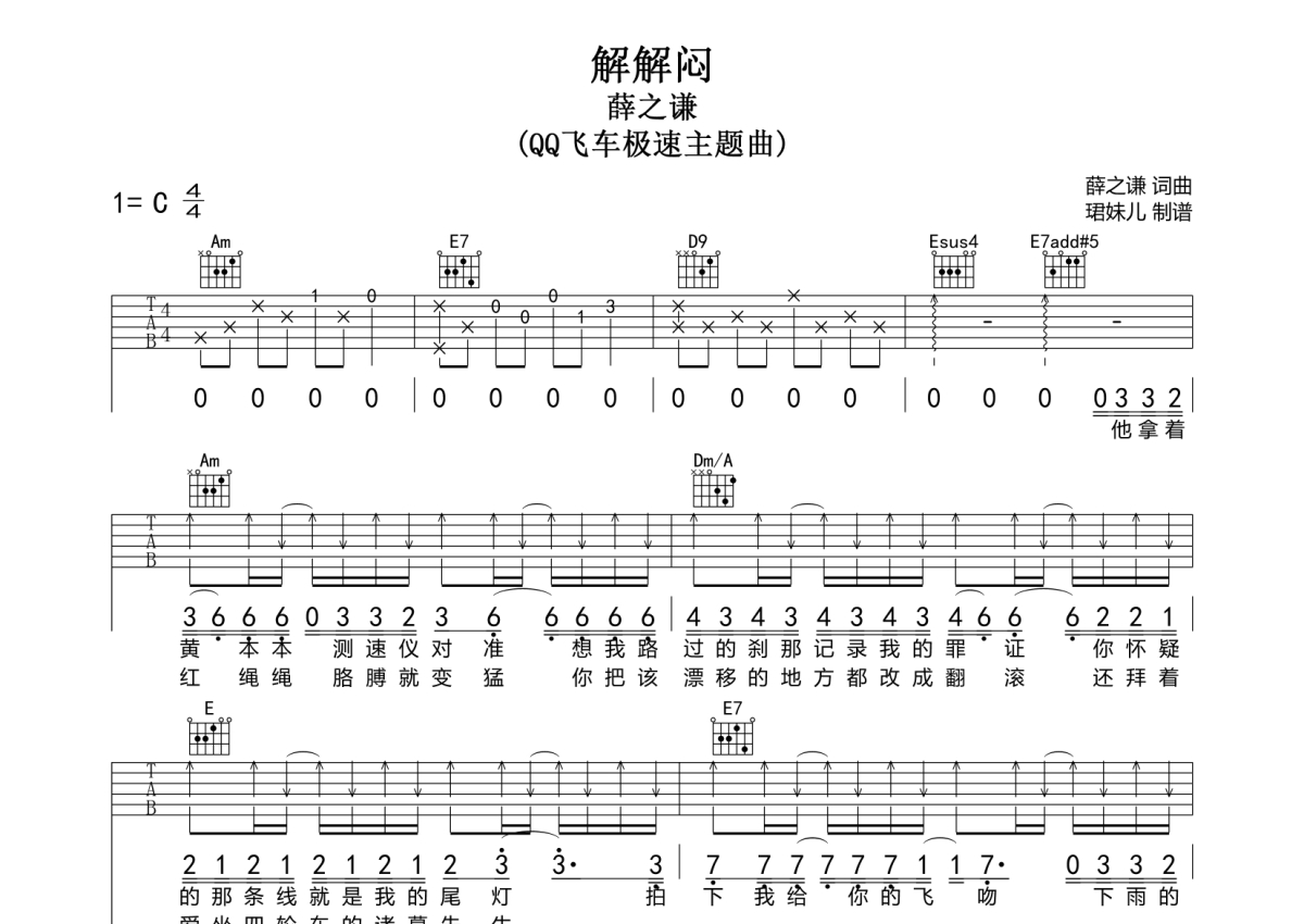 曲谱介绍: 薛之谦《解解闷》吉他弹唱谱,采用C调指法编配,珺妹儿编配出品,共有3张高清图谱。