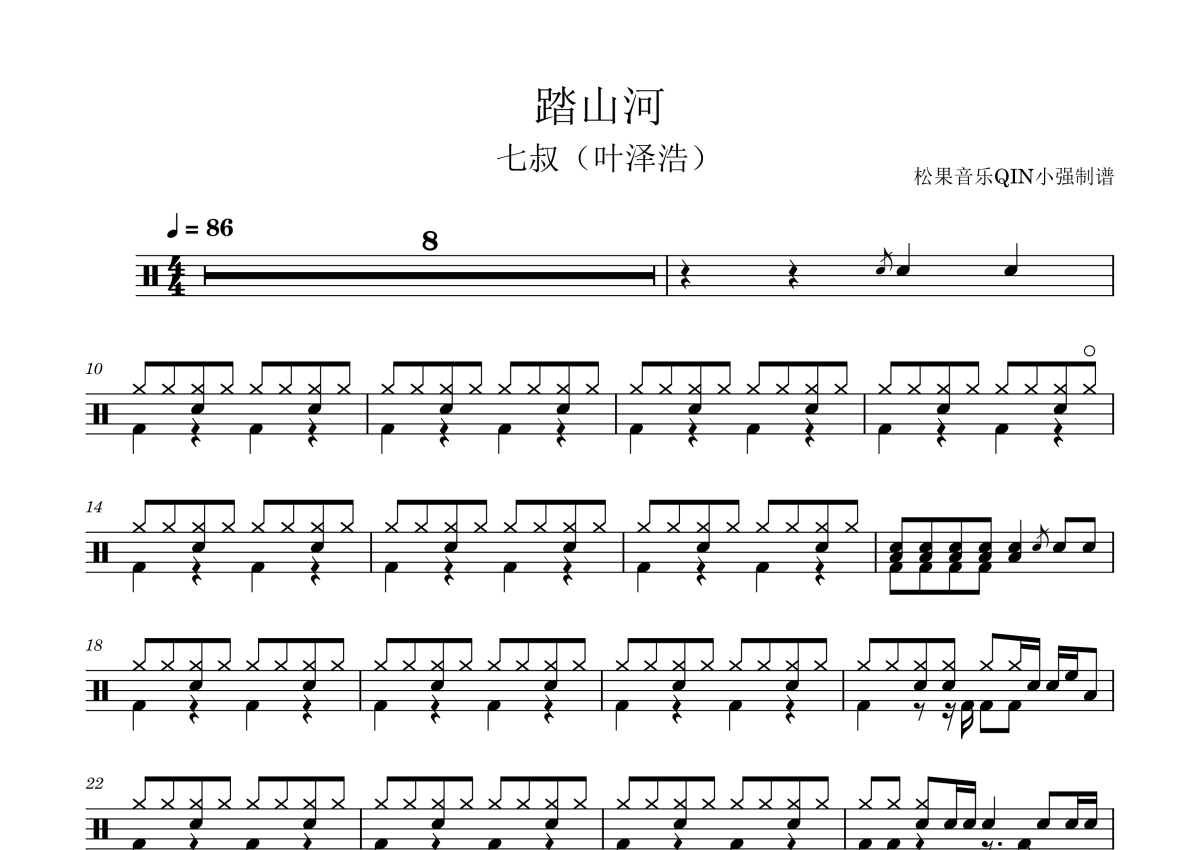 曲谱介绍: 七叔《踏山河》架子鼓谱,松果音乐QIN小强编配出品,共有2张高清图谱,免翻页排版设计。