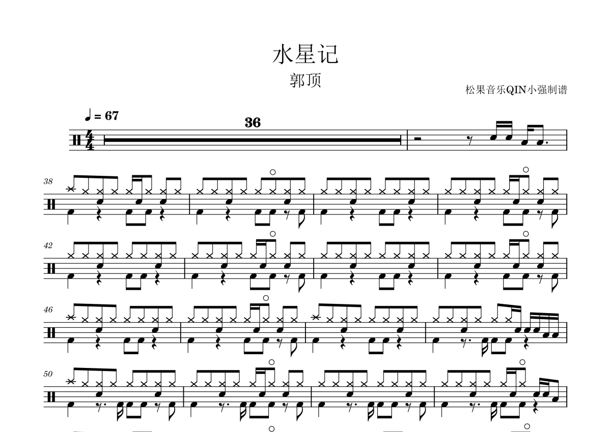 曲谱介绍: 郭顶《水星记》架子鼓谱,松果音乐QIN小强编配出品,共有1张高清图谱,免翻页排版设计。