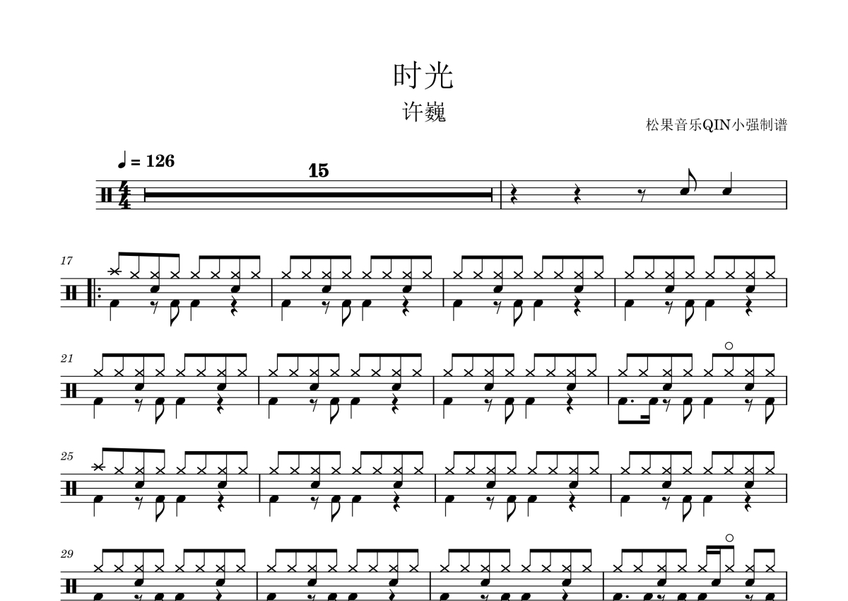 曲谱介绍: 许巍《时光》架子鼓谱,松果音乐QIN小强编配出品,共有3张高清图谱。