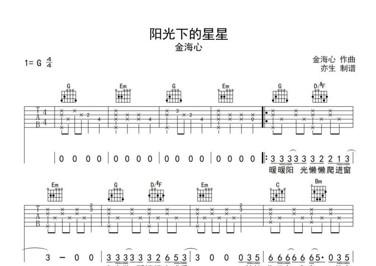 曲谱介绍: 金海心《阳光下的星星》吉他弹唱谱,采用G调指法编配,亦生编配出品,共有3张高清图谱。