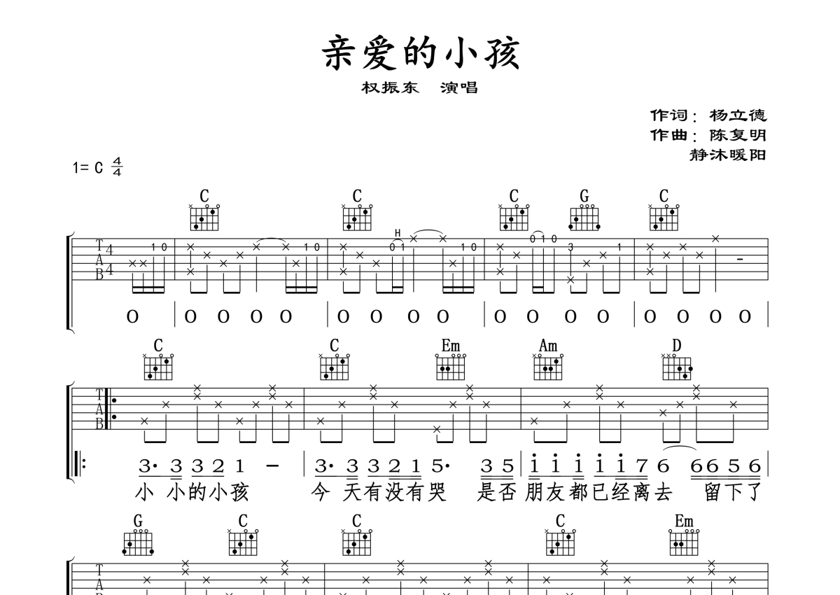 曲谱介绍: 权振东《亲爱的小孩》吉他弹唱谱,采用C调指法编配,静沐暖阳编配出品,共有2张高清图谱,免翻页排版设计。