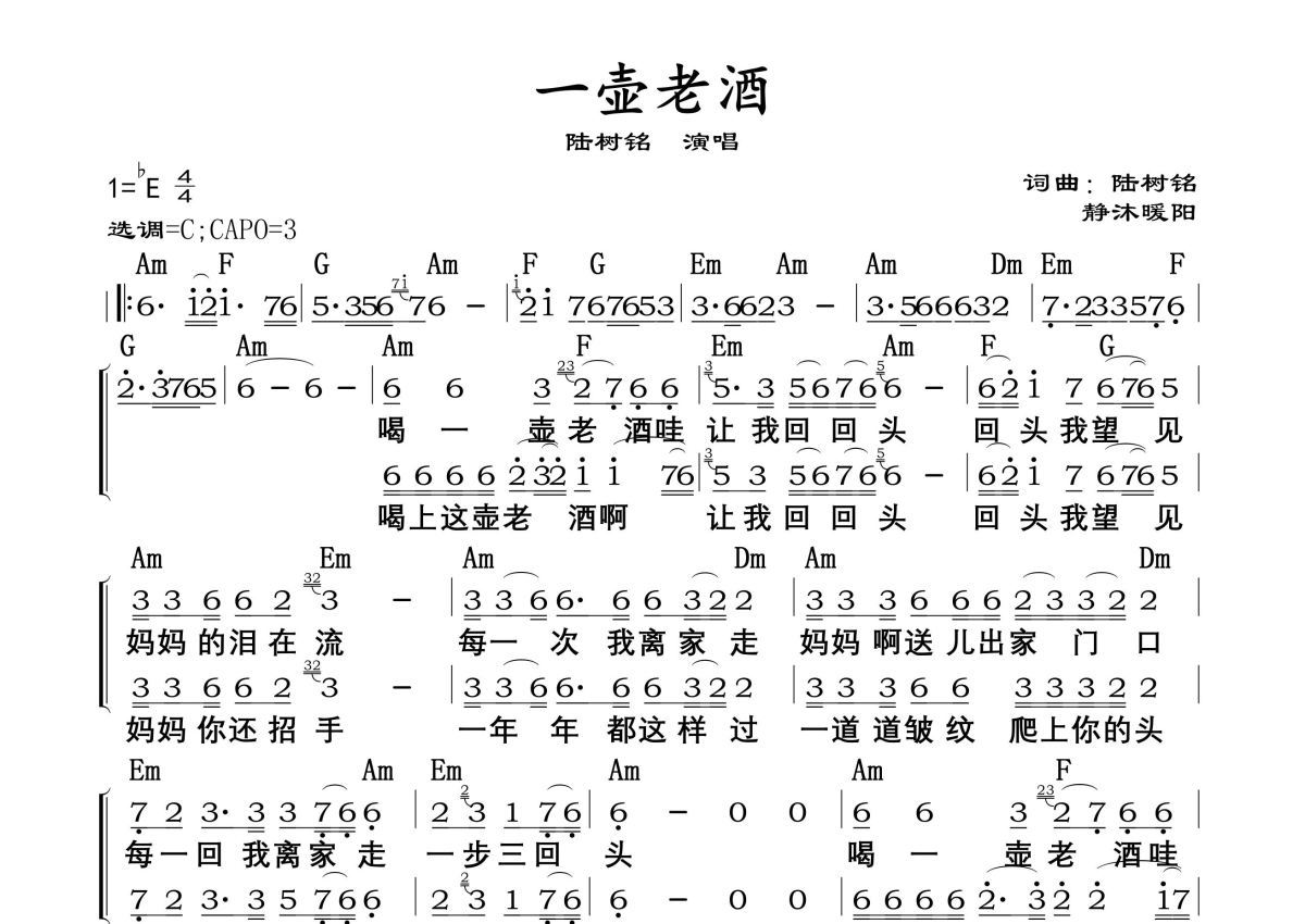 曲谱介绍: 陆树铭《一壶老酒》,静沐暖阳编配出品,共有1张高清图谱,免翻页排版设计。