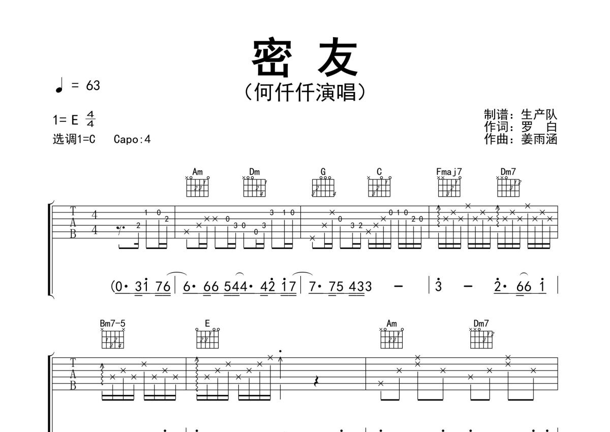 曲谱介绍: 何仟仟《密友》吉他弹唱谱,采用C调指法编配精编完美版,生产队编配出品,共有3张高清图谱。