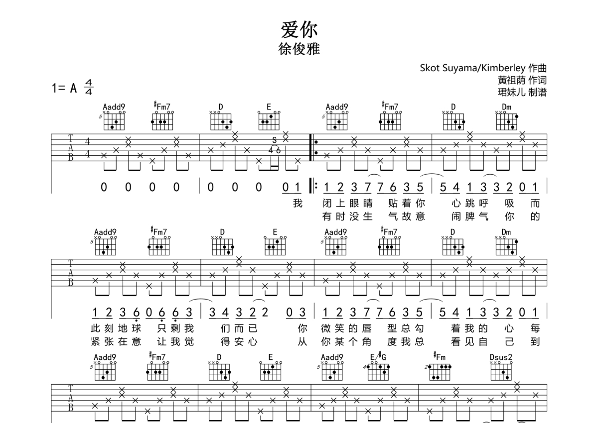 • 爱你吉他谱 - 徐俊雅 - A调吉他弹唱谱第1张