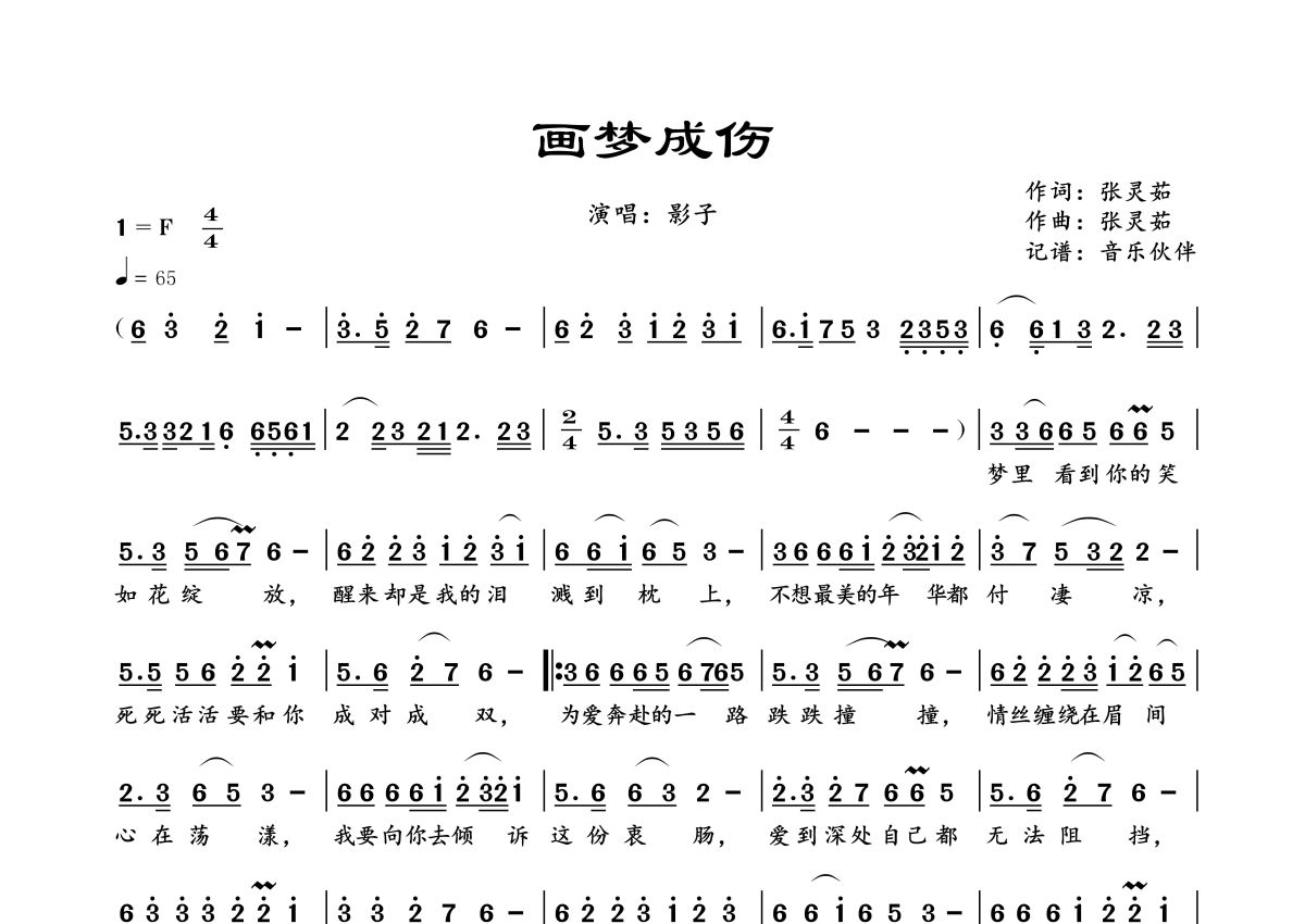 曲谱介绍: 影子《画梦成伤》,音乐伙伴编配出品,共有1张高清图谱,免翻页排版设计。