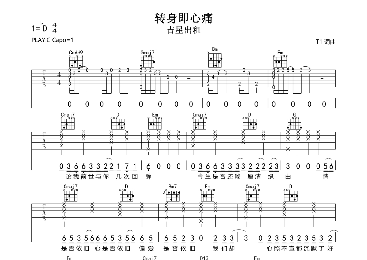 • 转身即心痛吉他谱 - 吉星出租 - C调吉他弹唱谱第1张