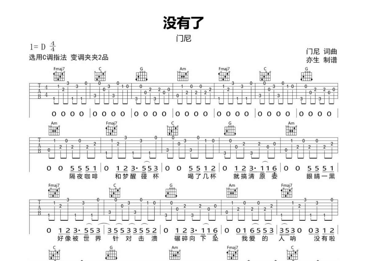 曲谱介绍: 门尼《没有了》吉他弹唱谱,采用C调指法编配,亦生编配出品,共有3张高清图谱。