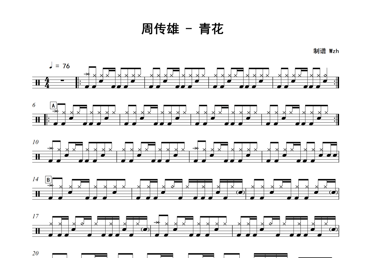 曲谱介绍: 周传雄《青花》架子鼓谱,Sawubona编配出品,共有2张高清图谱,免翻页排版设计。