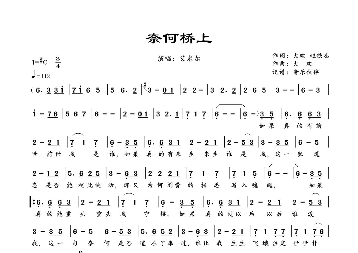 曲谱介绍: 艾米尔《奈何桥上》,音乐伙伴编配出品,共有1张高清图谱,免翻页排版设计。