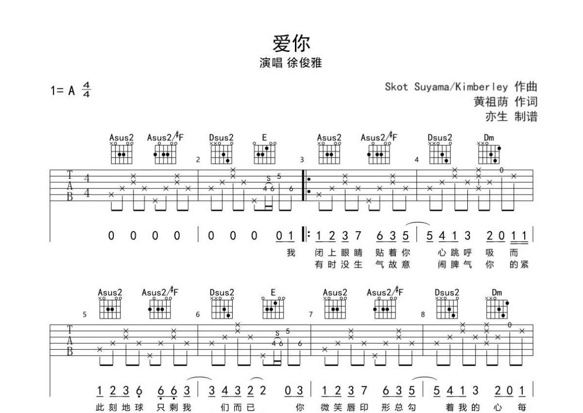 • 爱你吉他谱 - 徐俊雅 - A调吉他弹唱谱第1张