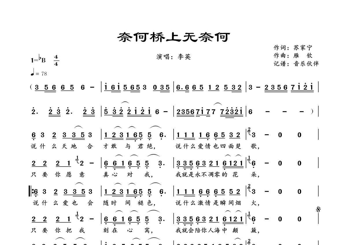 曲谱介绍: 李英《奈何桥上无奈何》,音乐伙伴编配出品,共有1张高清图谱,免翻页排版设计。