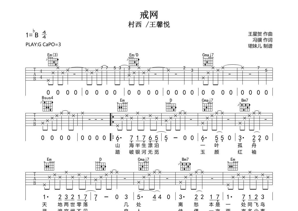 戒网吉他谱 - 村西 /王馨悦 - G调吉他弹唱谱