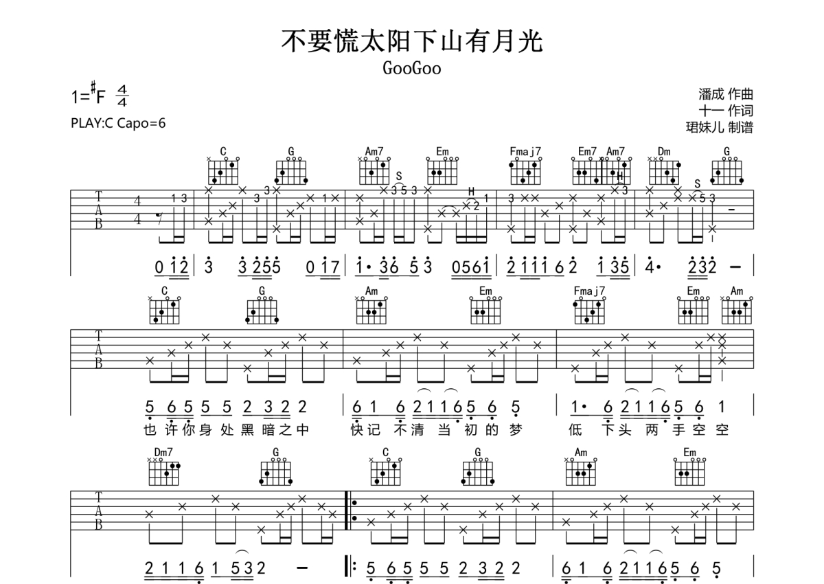 • 不要慌太阳下山有月光吉他谱 - GooGoo - C调吉他弹唱谱第1张