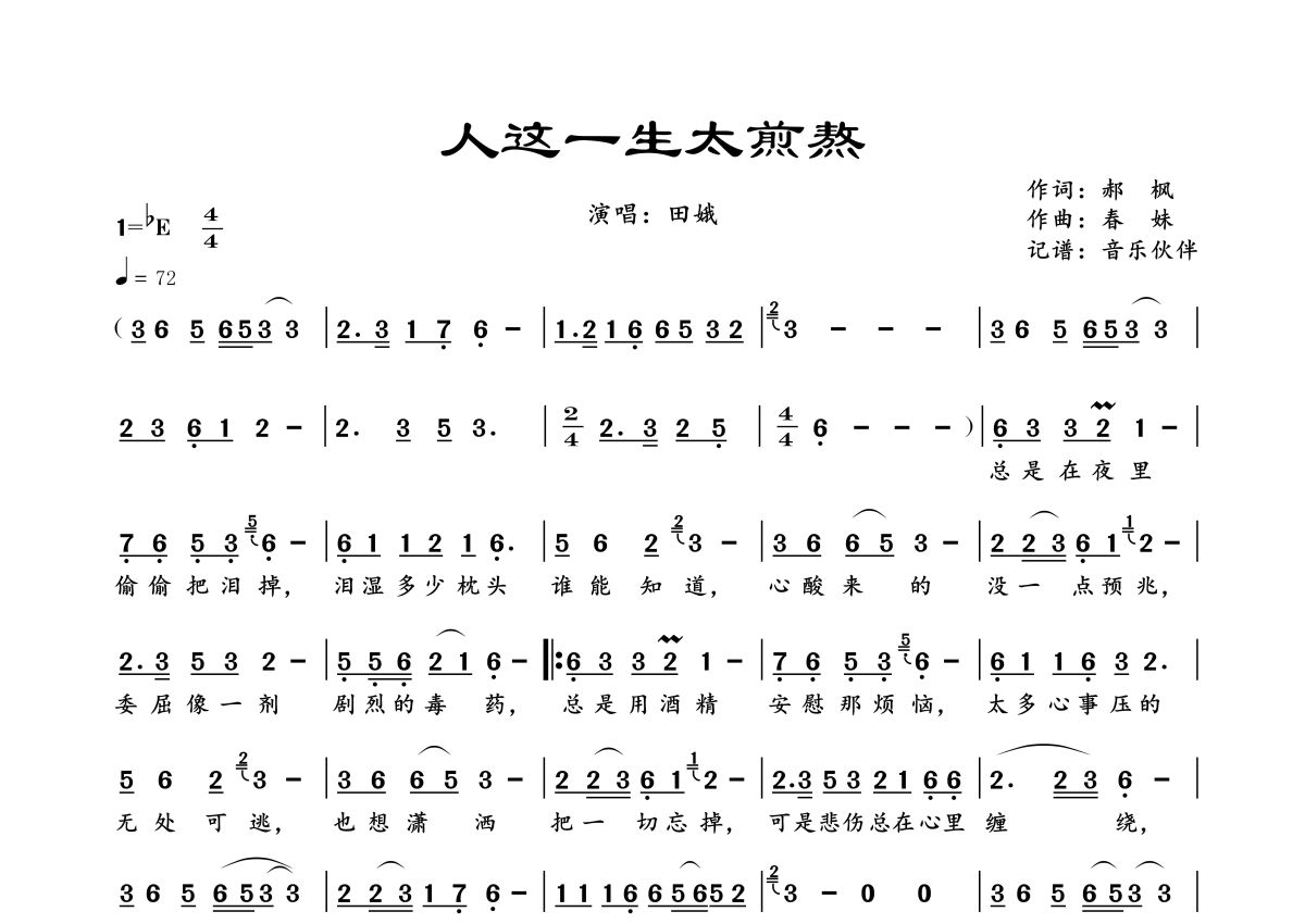 曲谱介绍: 田娥《人这一生太煎熬》,音乐伙伴编配出品,共有1张高清图谱,免翻页排版设计。