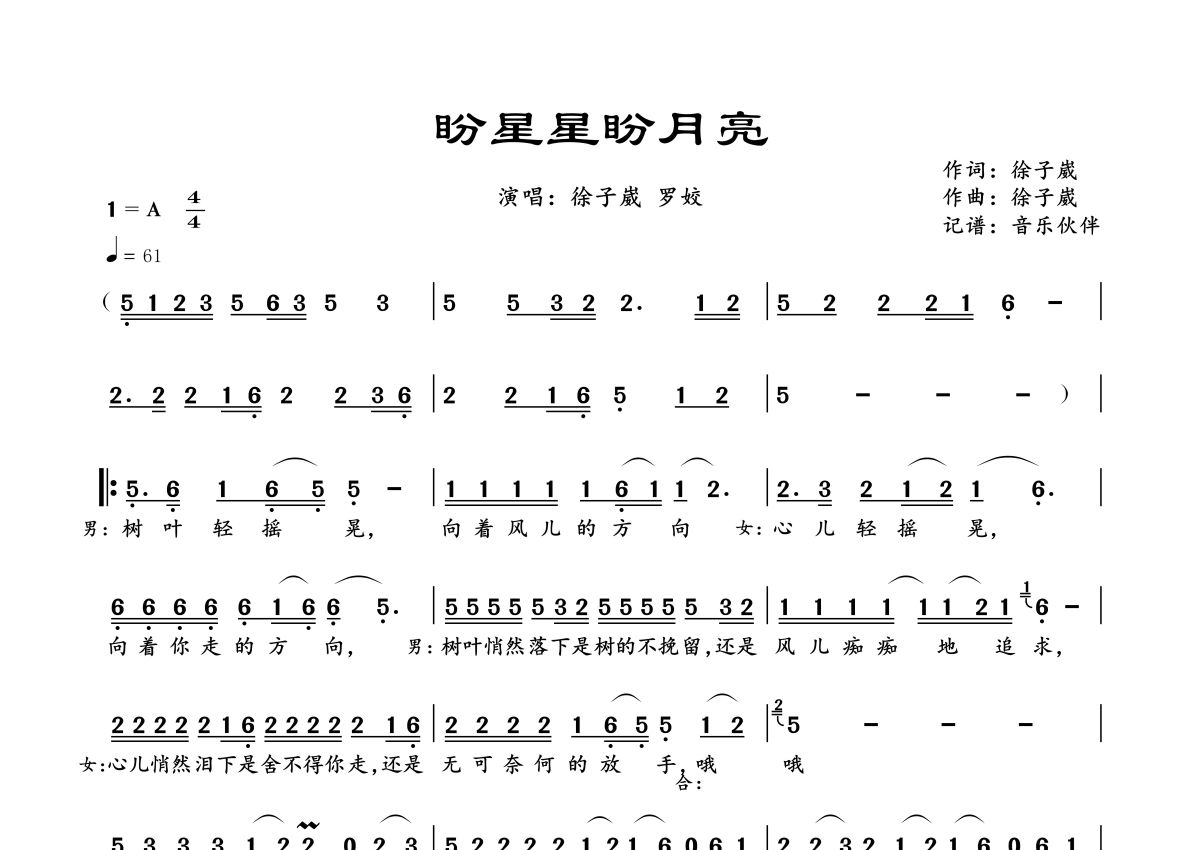 曲谱介绍: 徐子崴罗姣《盼星星盼月亮》,音乐伙伴编配出品,共有2张高清图谱,免翻页排版设计。