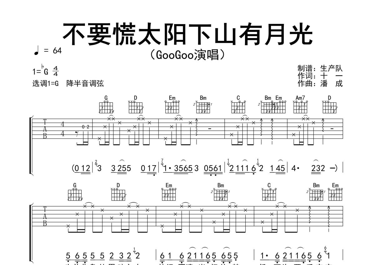 曲谱介绍: GooGoo《不要慌太阳下山有月光》吉他弹唱谱,采用G调指法编配精编完美版,生产队编配出品,共有2张高清图谱,免翻页排版设计。