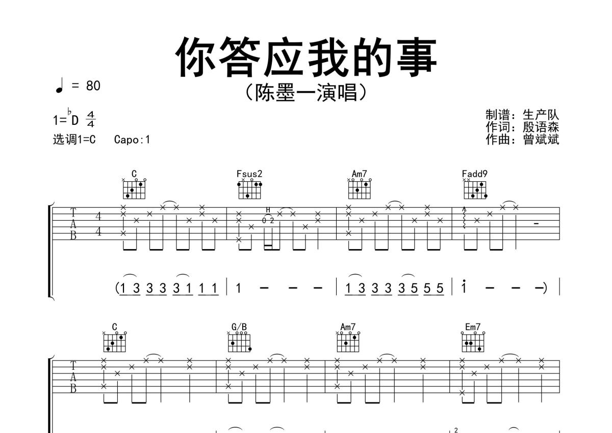 曲谱介绍: 陈墨一《你答应我的事》吉他弹唱谱,采用C调指法编配精编完美版,生产队编配出品,共有3张高清图谱。