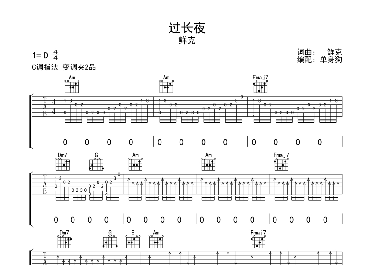 曲谱介绍: 鲜克《过长夜》吉他弹唱谱,采用C调指法编配,单身狗编配出品,共有4张高清图谱。