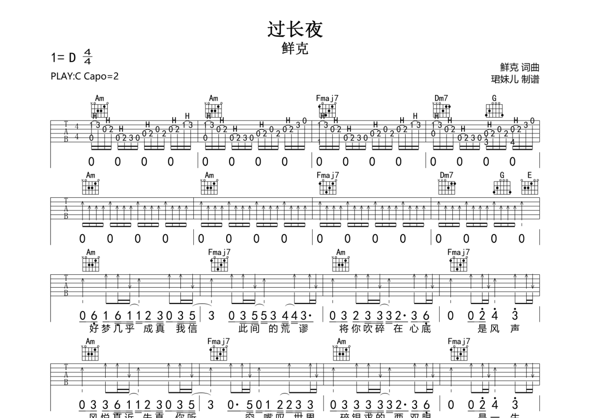 • 过长夜吉他谱 - 鲜克 - C调吉他弹唱谱第1张