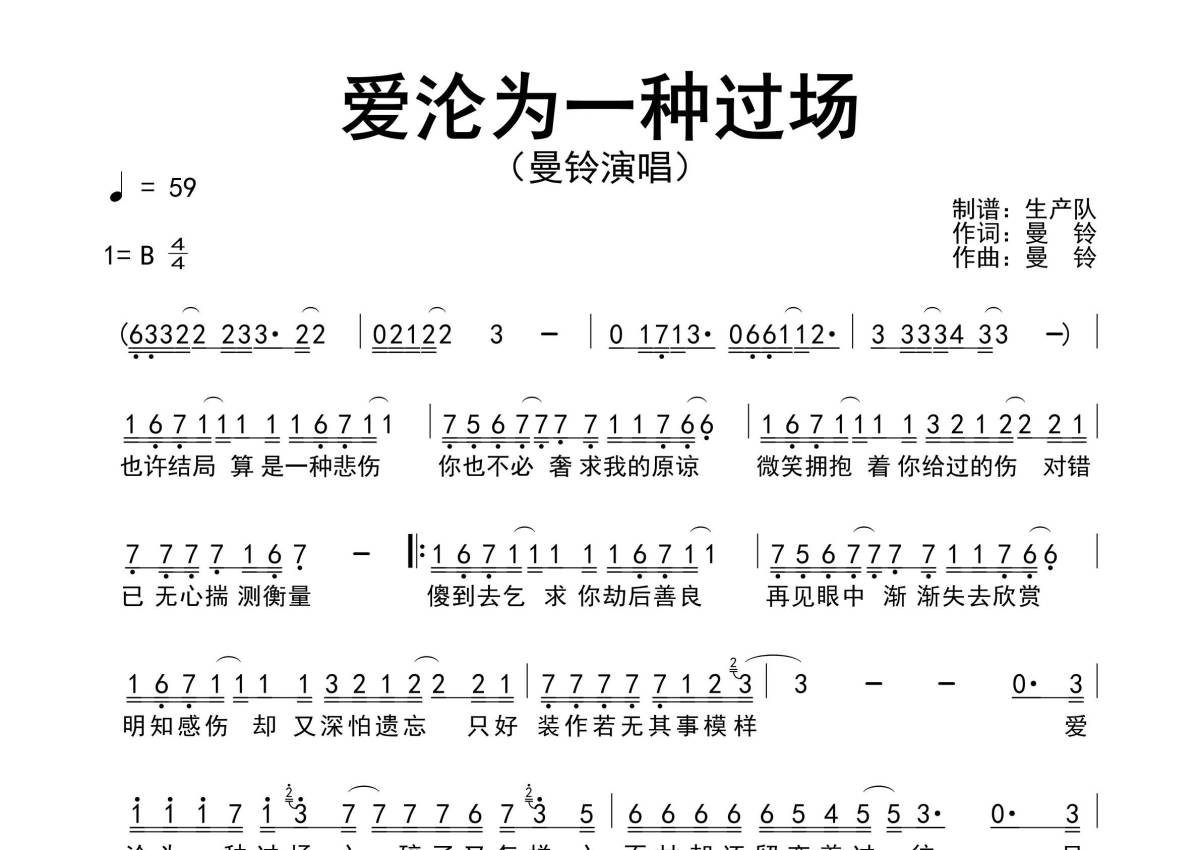 曲谱介绍: 曼铃《爱沦为一种过场》原版简谱,生产队编配出品,共有1张高清图谱,免翻页排版设计。