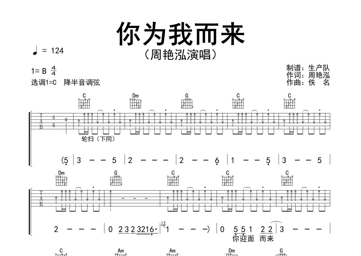 曲谱介绍: 周艳泓《你为我而来》吉他弹唱谱,采用C调指法编配精编轮扫版,生产队编配出品,共有3张高清图谱。