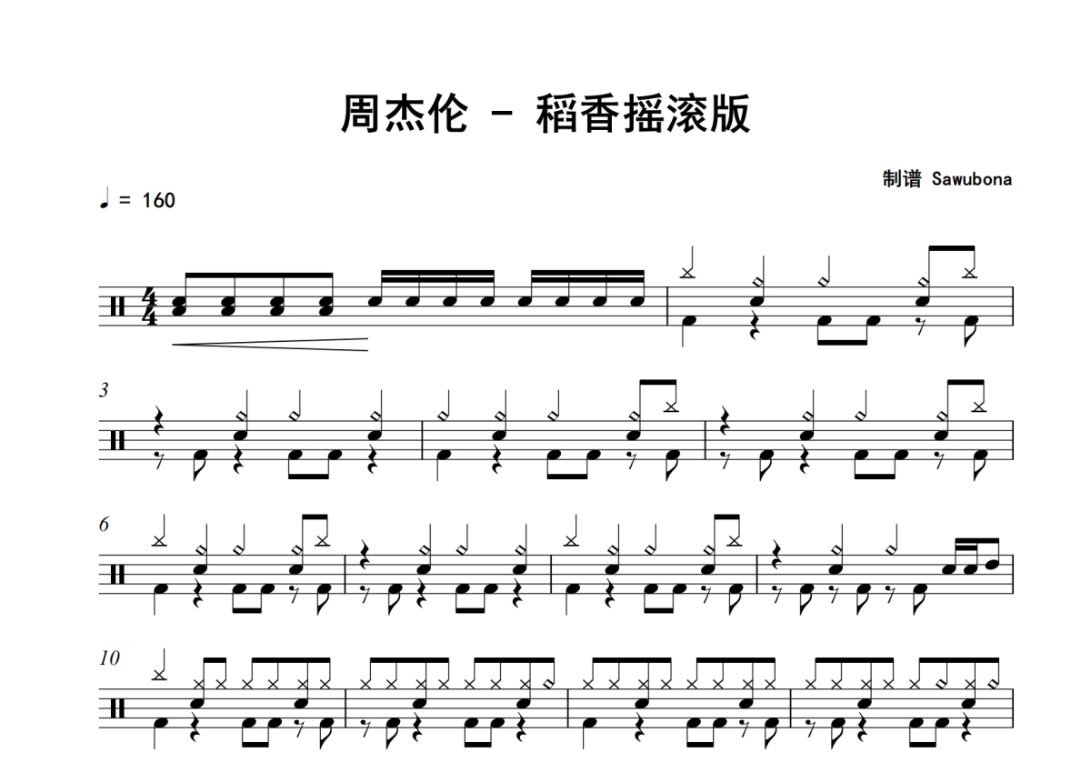 曲谱介绍: 周杰伦《稻香》架子鼓谱Remix摇滚版,Sawubona编配出品,共有2张高清图谱,免翻页排版设计。
