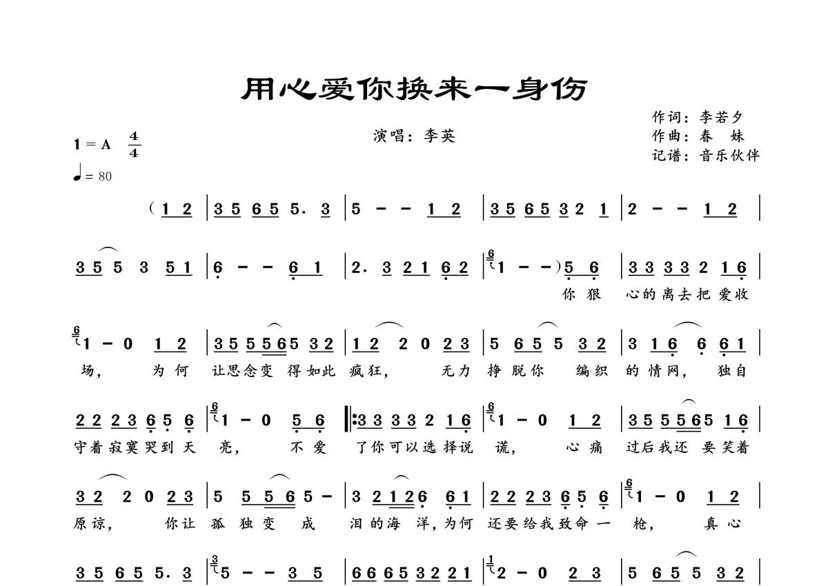 曲谱介绍: 李英《用心爱你换来一身伤》,音乐伙伴编配出品,共有1张高清图谱,免翻页排版设计。