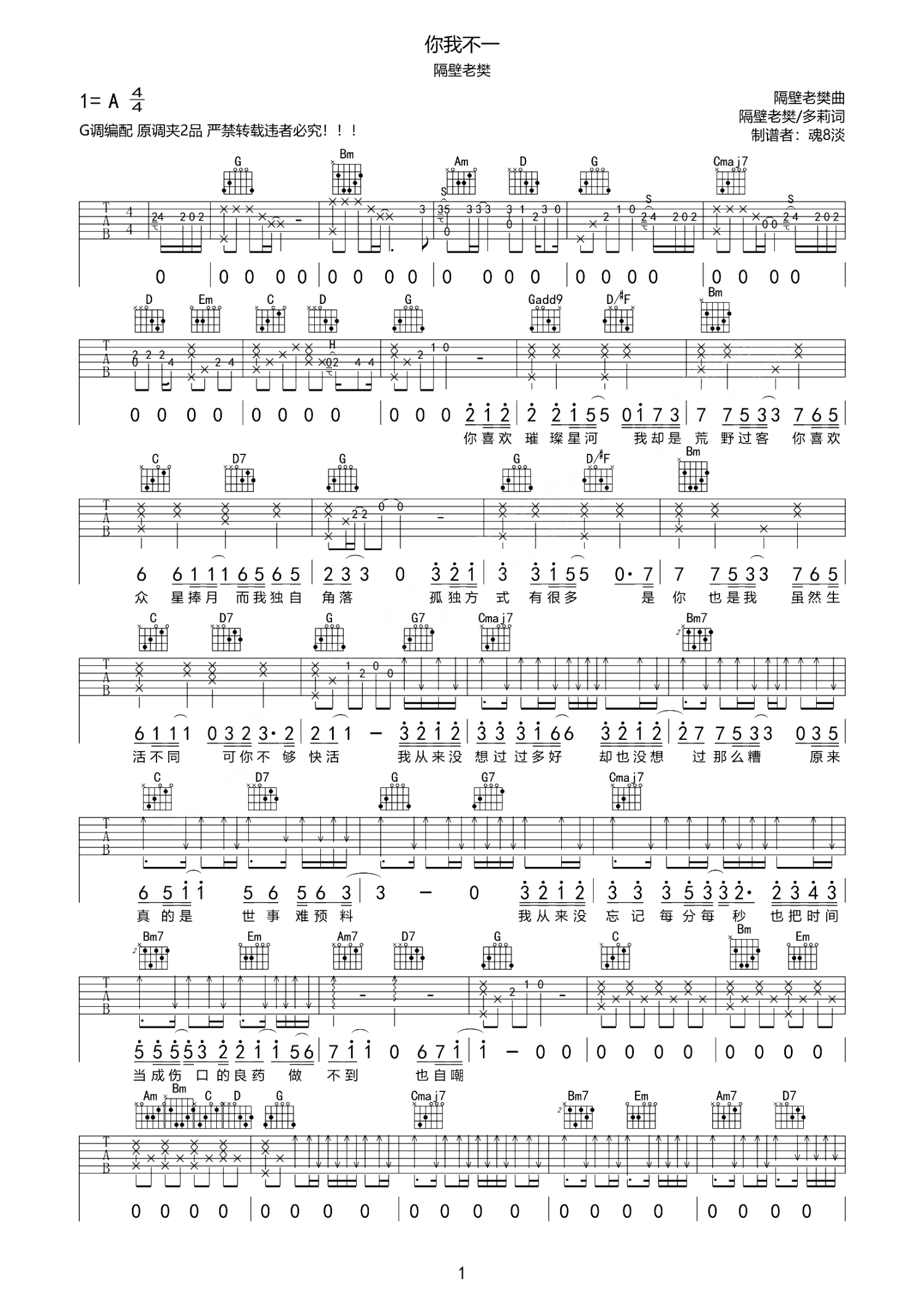 你我不一吉他谱 - 隔壁老樊 - G调吉他弹唱谱