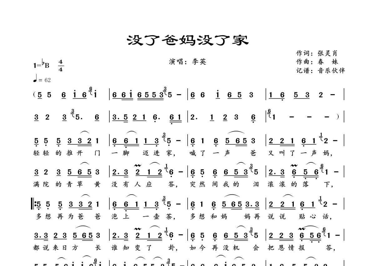 曲谱介绍: 李英《没了爸妈没了家》,音乐伙伴编配出品,共有1张高清图谱,免翻页排版设计。