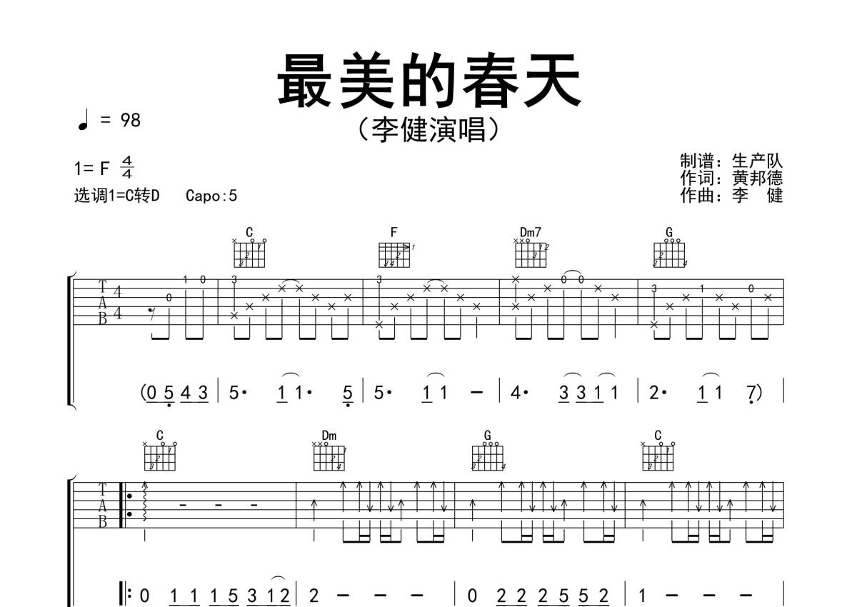 曲谱介绍: 李健《最美的春天》吉他弹唱谱,采用C调指法编配精编完美版,生产队编配出品,共有3张高清图谱。