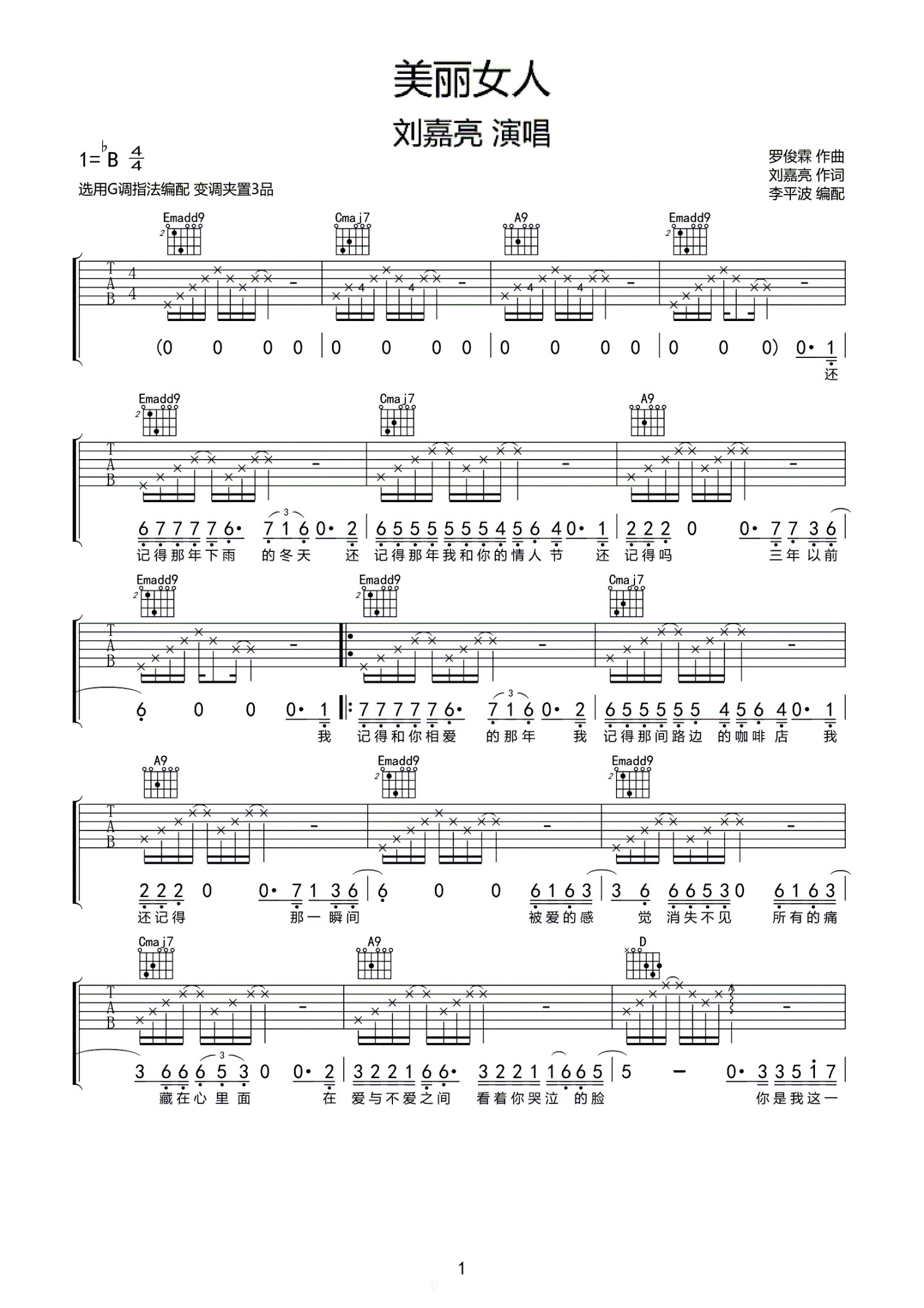 曲谱介绍: 刘嘉亮《美丽女人》吉他谱_G调吉他弹唱谱