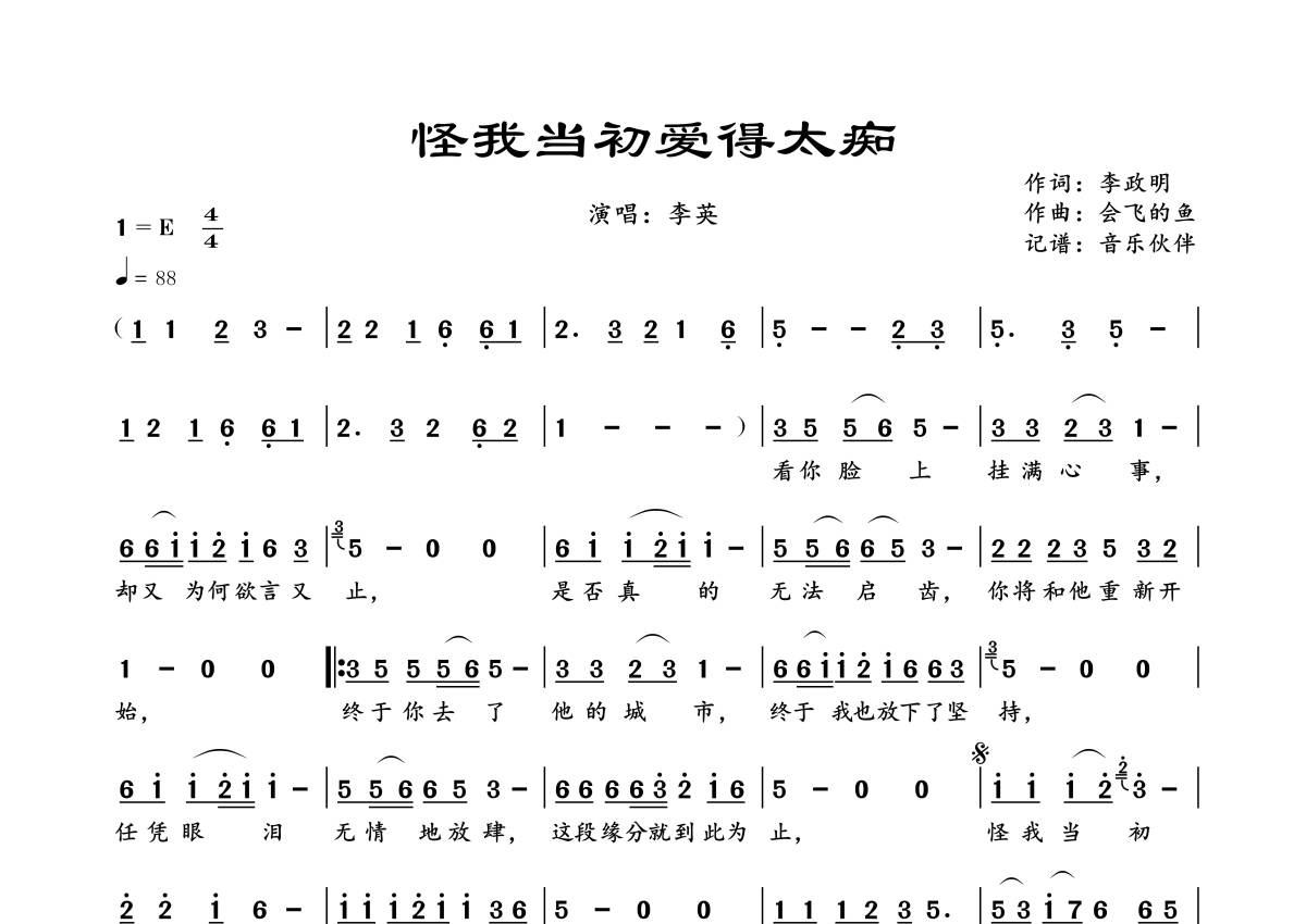 曲谱介绍: 李英《怪我当初爱得太痴》,音乐伙伴编配出品,共有1张高清图谱,免翻页排版设计。