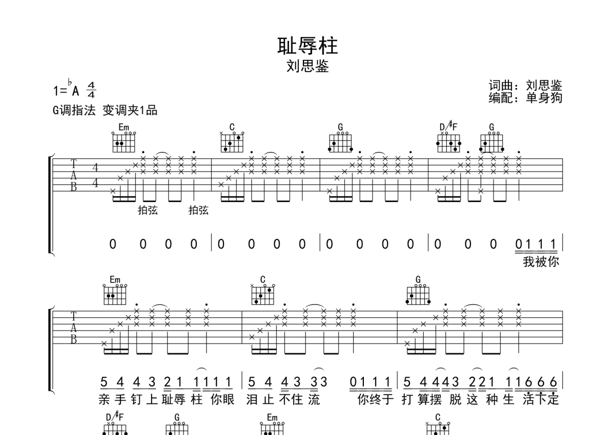 曲谱介绍: 刘思鉴《耻辱柱》吉他弹唱谱,采用G调指法编配,单身狗编配出品,共有3张高清图谱。