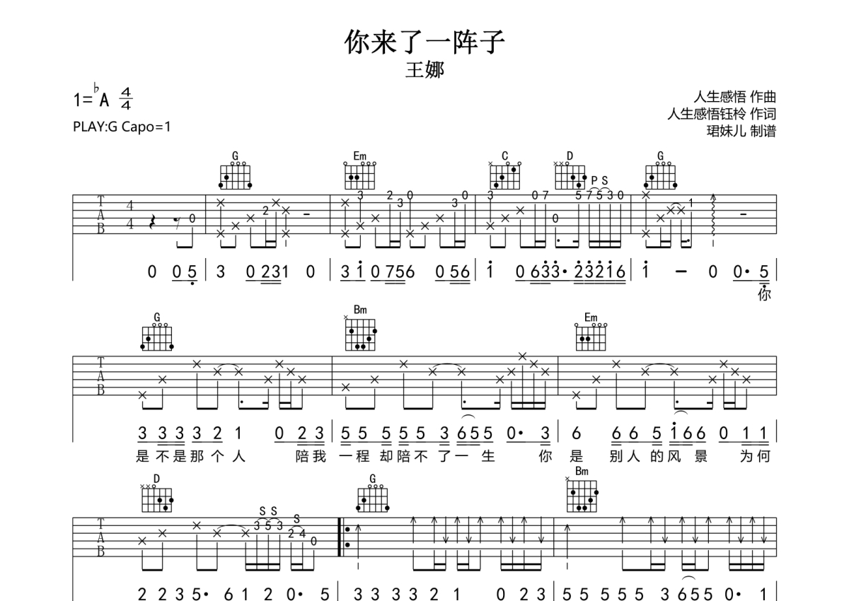 • 你来了一阵子吉他谱 - 王娜 - G调吉他弹唱谱第1张