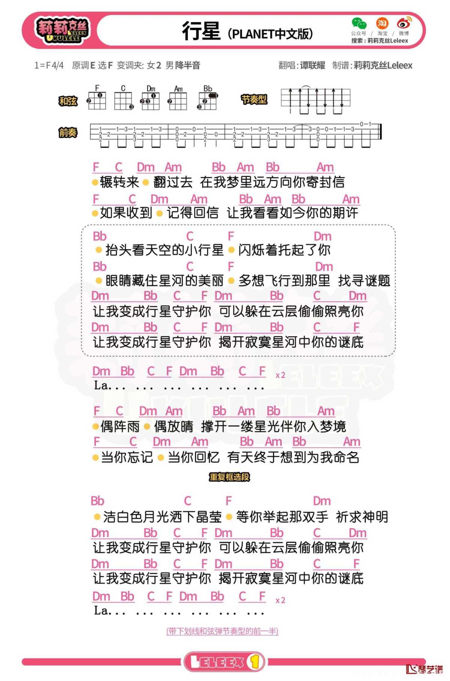 曲谱介绍: 《行星》《PLANET中文版》尤克里里弹唱曲谱(简版)