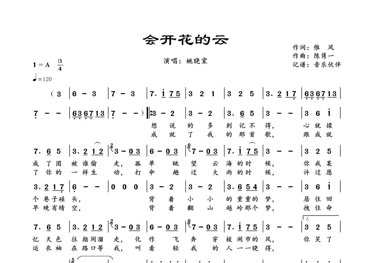曲谱介绍: 姚晓棠《会开花的云》,音乐伙伴编配出品,共有1张高清图谱,免翻页排版设计。