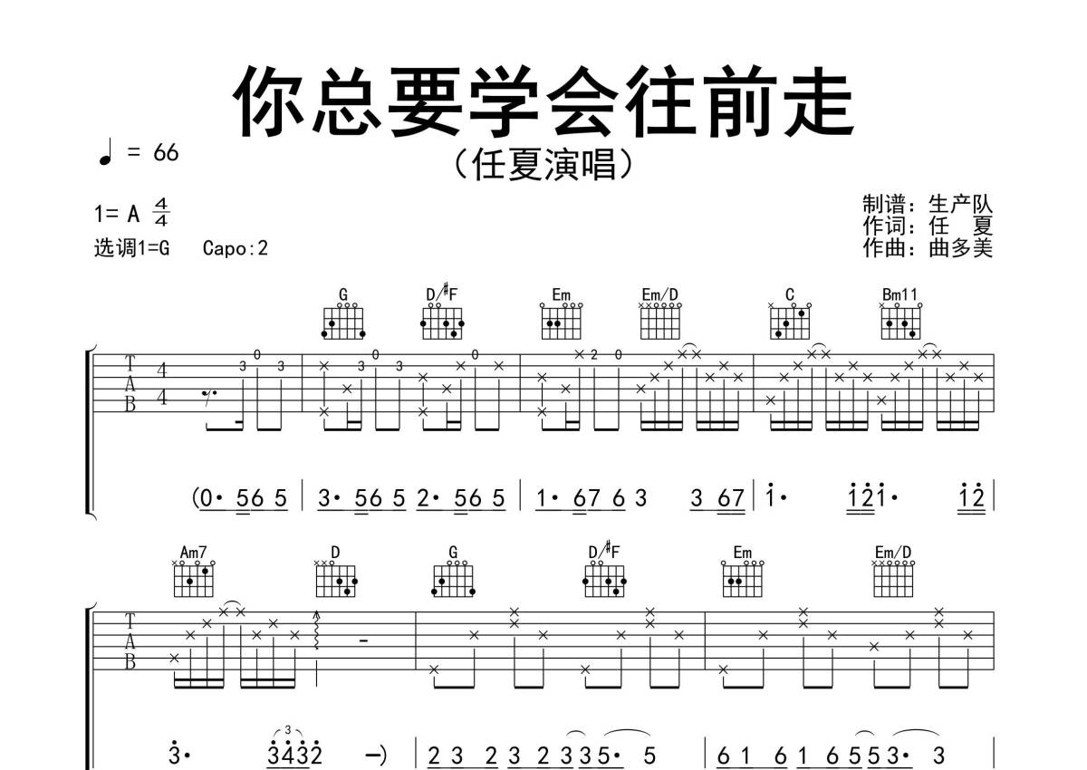 曲谱介绍: 任夏《你总要学会往前走》吉他弹唱谱,采用G调指法编配精编完美版,生产队编配出品,共有2张高清图谱,免翻页排版设计。
