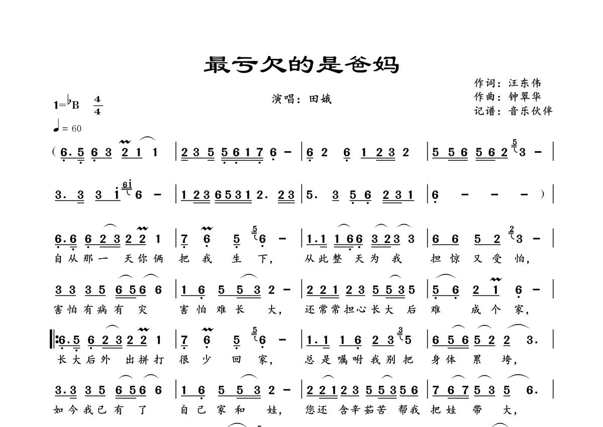 曲谱介绍: 田娥《最亏欠的是爸妈》,音乐伙伴编配出品,共有1张高清图谱,免翻页排版设计。