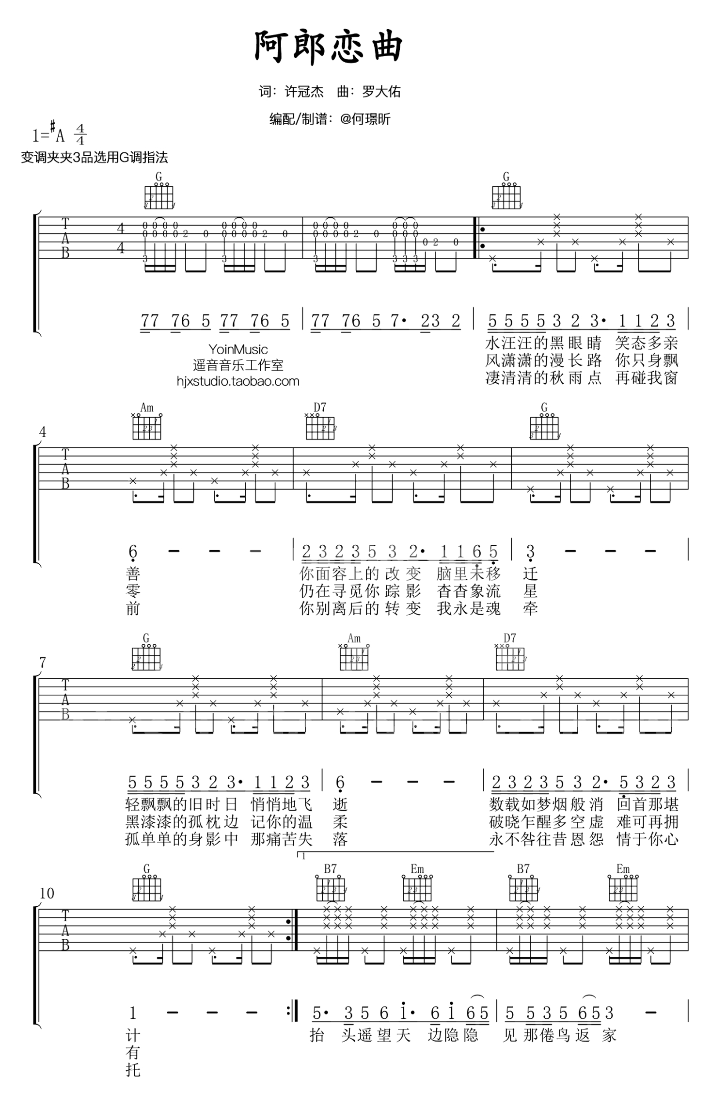 曲谱介绍: 阿郎恋曲吉他谱,许冠杰演唱,这首歌曲是罗大佑《恋曲1990》的粤语版,阿郎恋曲六线谱,G调指法,变调夹夹三品,尽量按照还原原曲编了简单的前奏和尾奏。