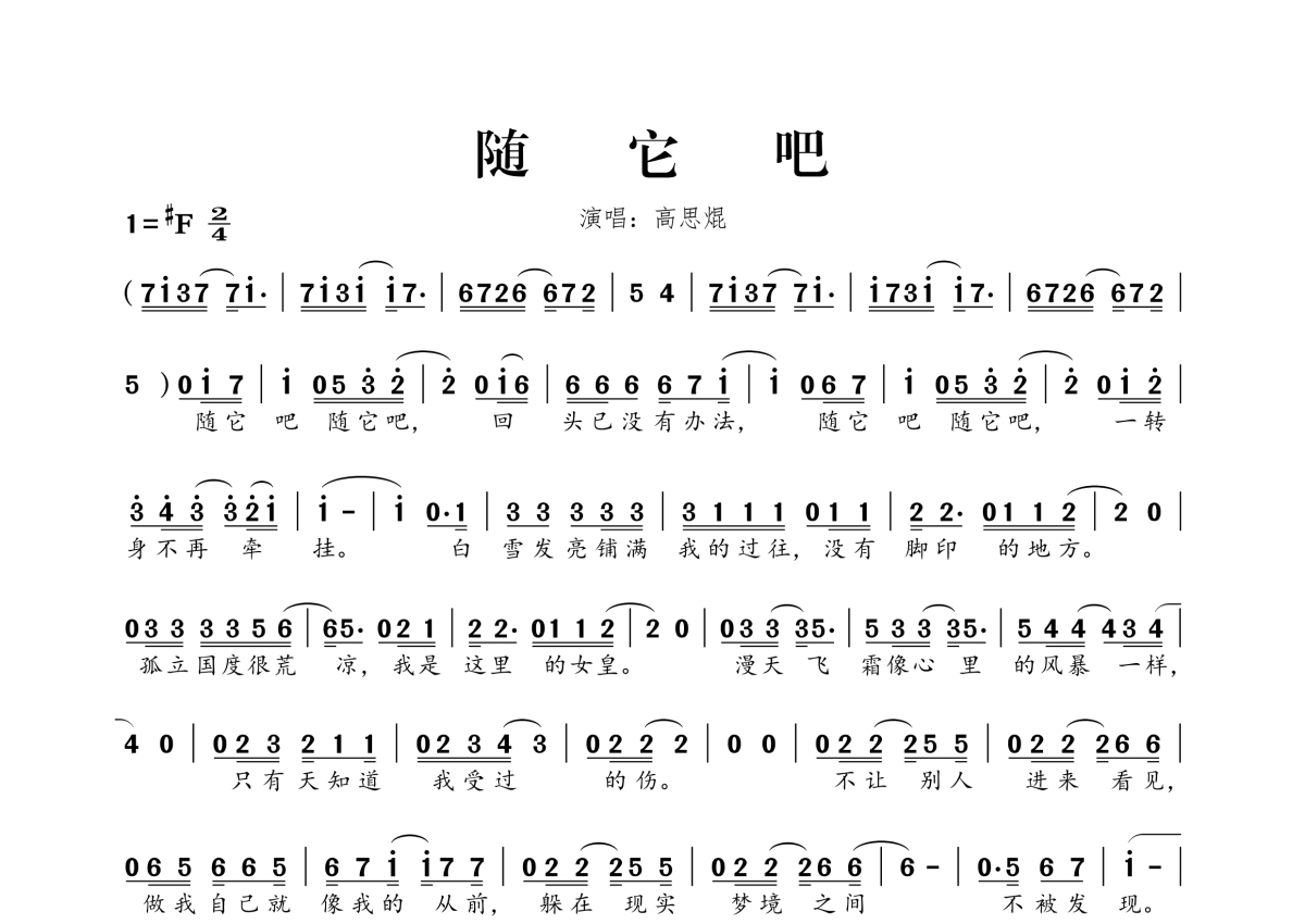 曲谱介绍: 高思焜《随它吧》,桃李醉春风编配出品,共有2张高清图谱,免翻页排版设计。