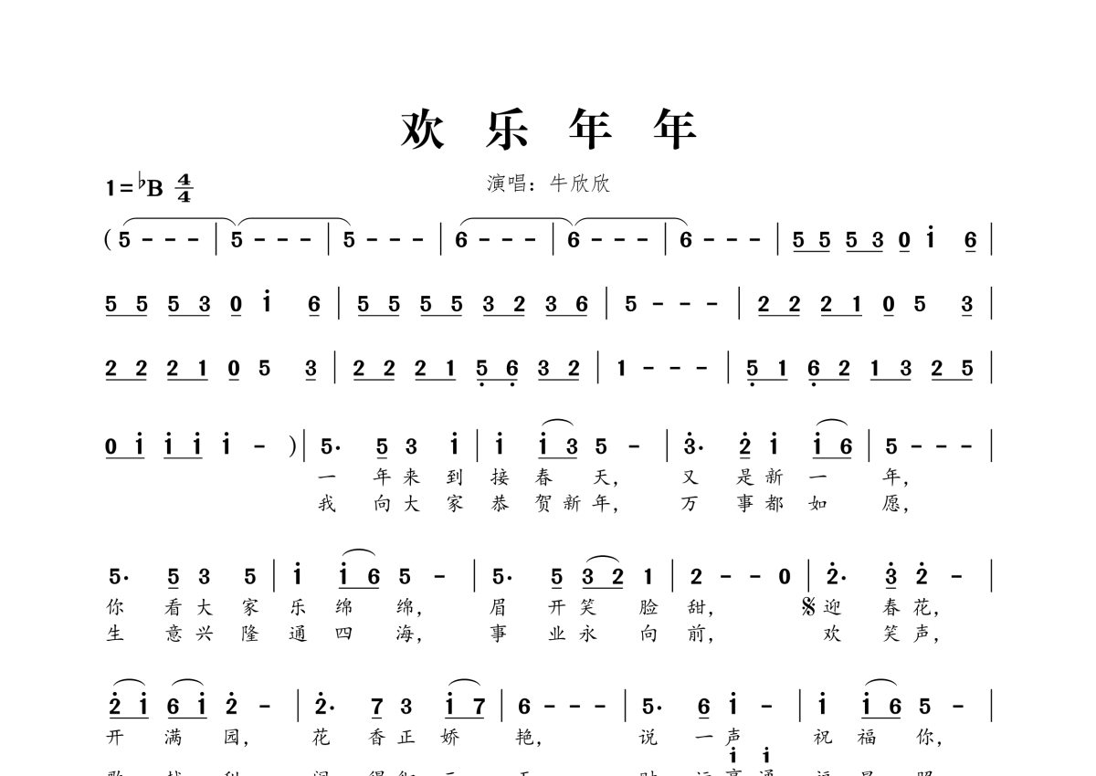 曲谱介绍: 牛欣欣《欢乐年年》,桃李醉春风编配出品,共有1张高清图谱,免翻页排版设计。