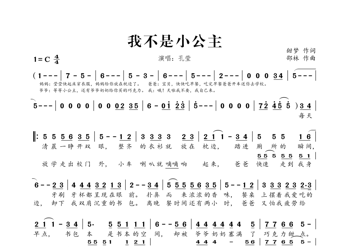 曲谱介绍: 孔莹《我不是小公主》,桃李醉春风编配出品,共有1张高清图谱,免翻页排版设计。