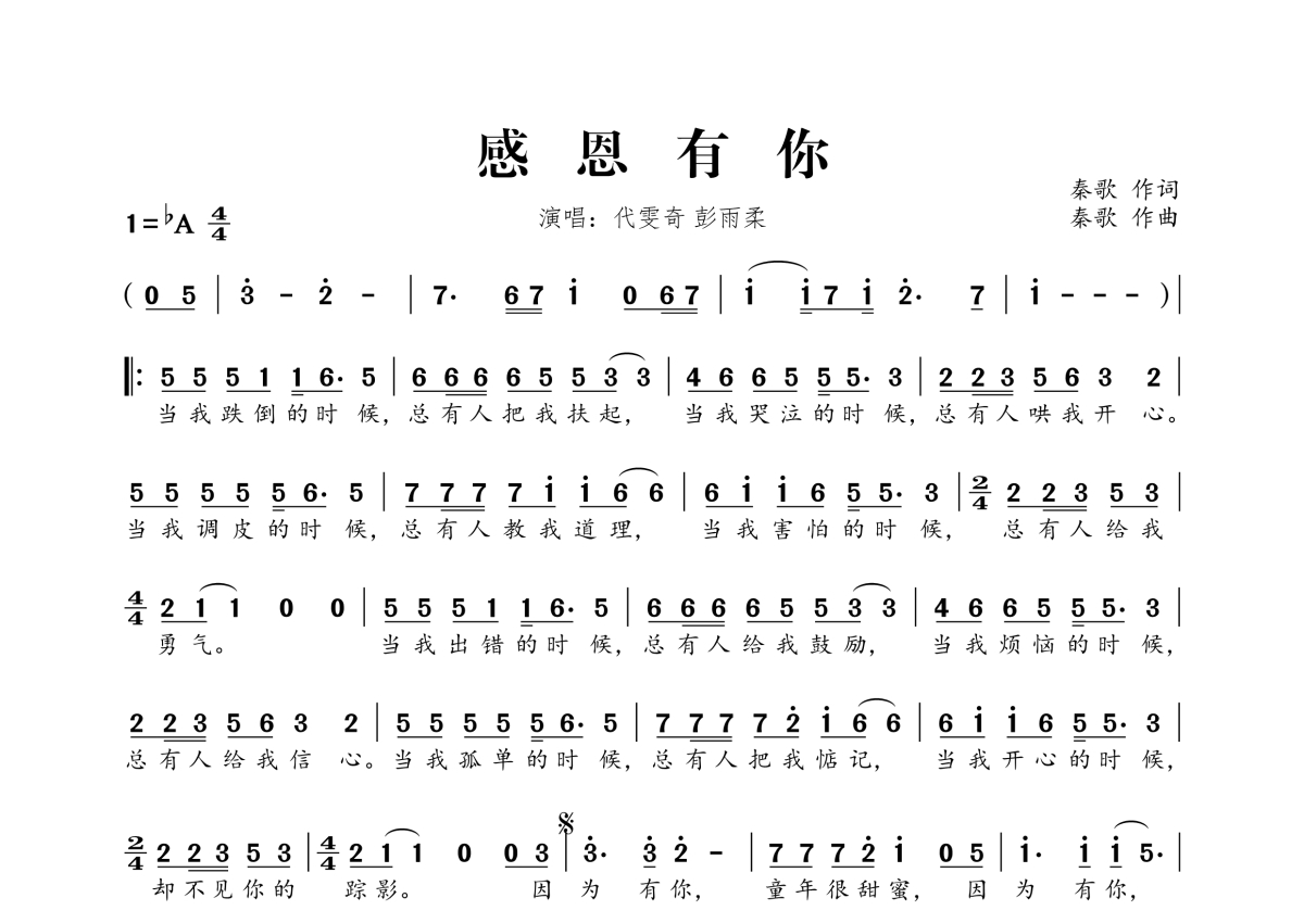 感恩有你简谱 - 代雯奇 彭雨柔