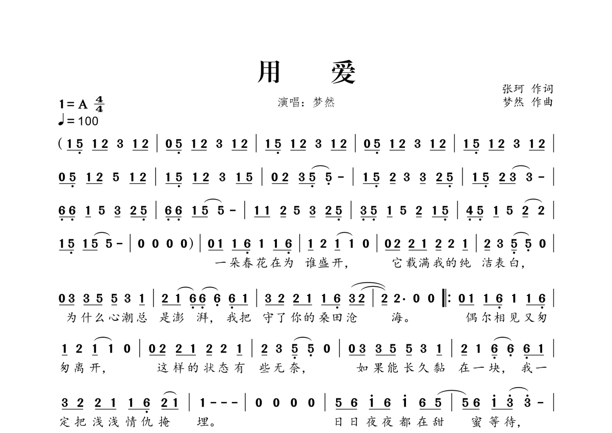 曲谱介绍: 梦然《用爱》,桃李醉春风编配出品,共有1张高清图谱,免翻页排版设计。