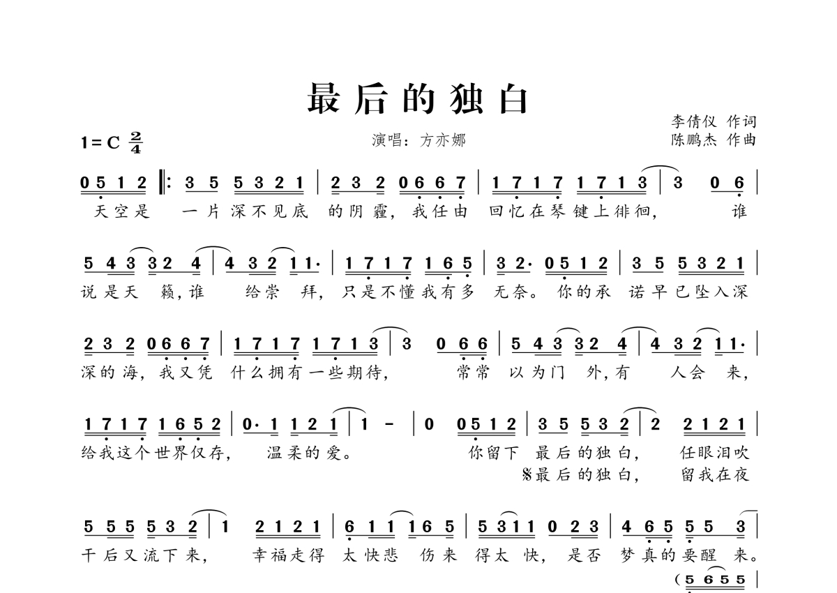 曲谱介绍: 方亦娜《最后的独白》,桃李醉春风编配出品,共有1张高清图谱,免翻页排版设计。